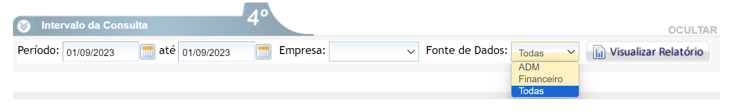 - Fonte de Dados: selecione qual a fonte de dados o sistema deverá utilizar para realizar a consulta. ADM, traz somente as informações do módulo ADM. Financeiro, traz somente as informações do módulo Financeiro. Todas, traz todas as informações, tanto do módulo ADM quanto do módulo Financeiro.