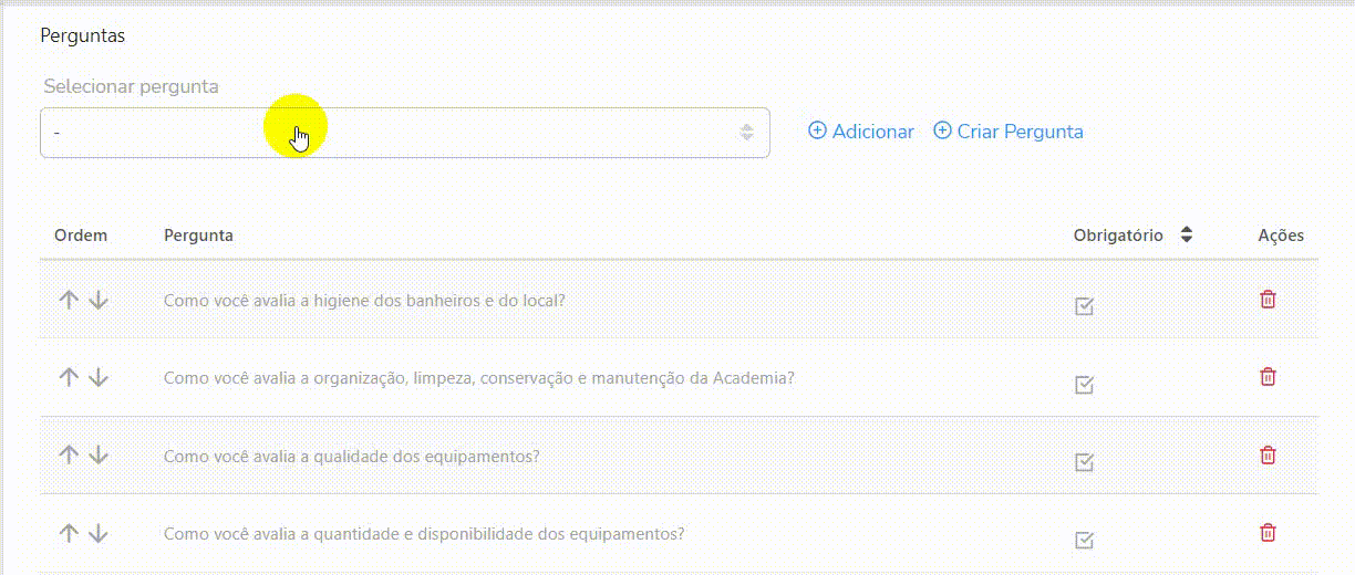 Para adicionar uma nova pergunta a um questionário existente, primeiro é necessário validar se a pergunta esta cadastrada no sistema. Acesse a listagem de perguntas e certifique que ela esta cadastrada.