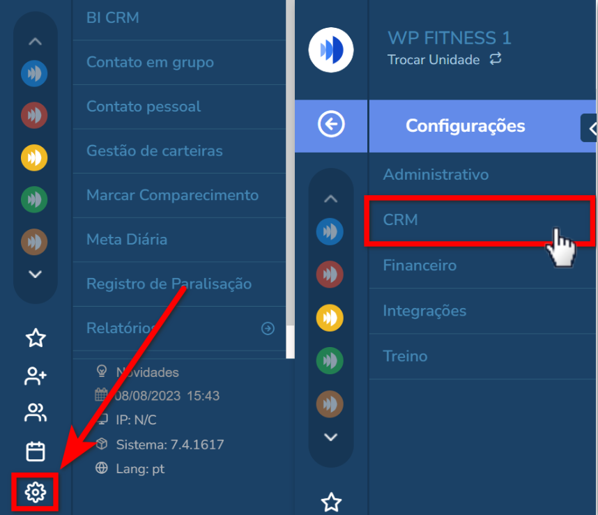 2. No menu lateral esquerdo clique no ícone de engrenagem e, em seguida, selecione a opção “CRM“;