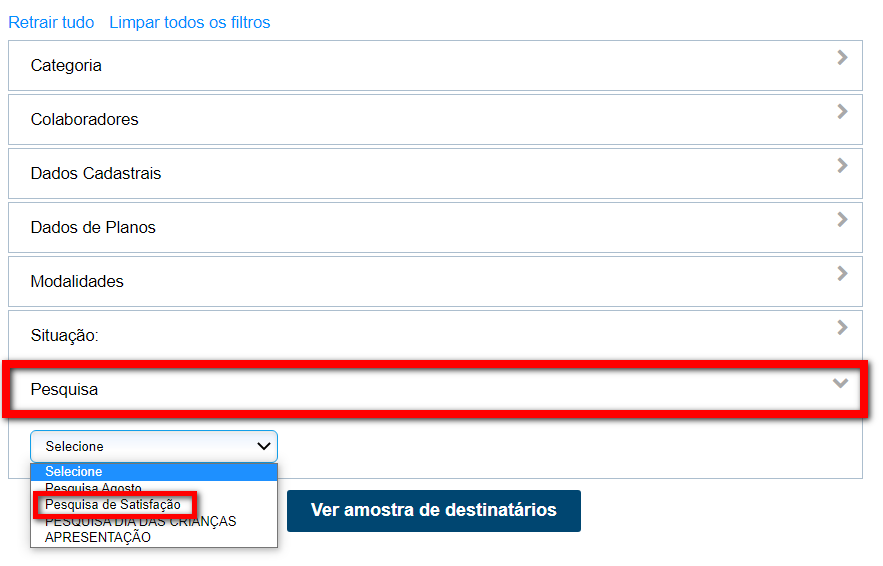 6. Ainda na parte de filtros, localize o campo "Pesquisas" e selecione a pesquisa que deseja enviar para seus clientes;