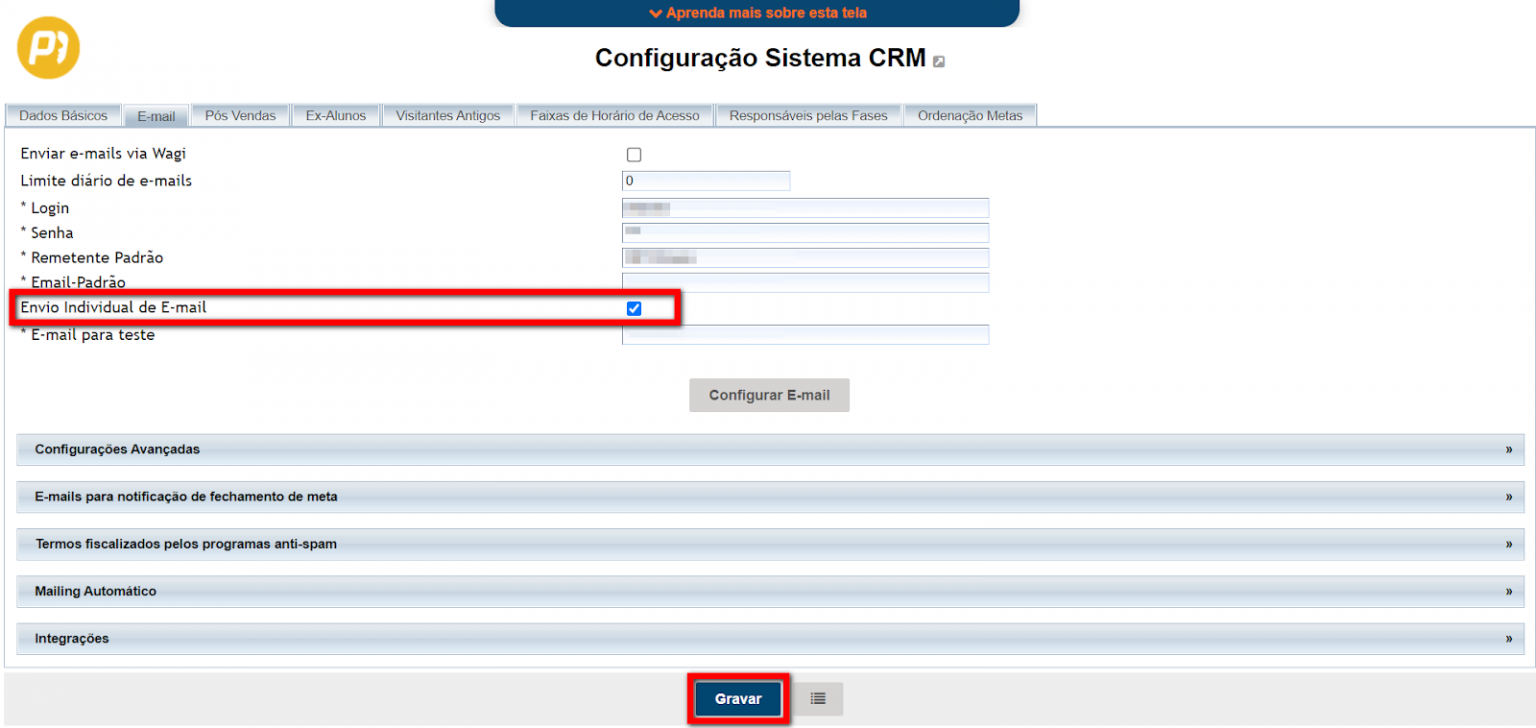 4. Identifique a configuração "Envio Individual de E-mail" e marque o checkbox a sua frente, em seguida clicar em "Gravar";