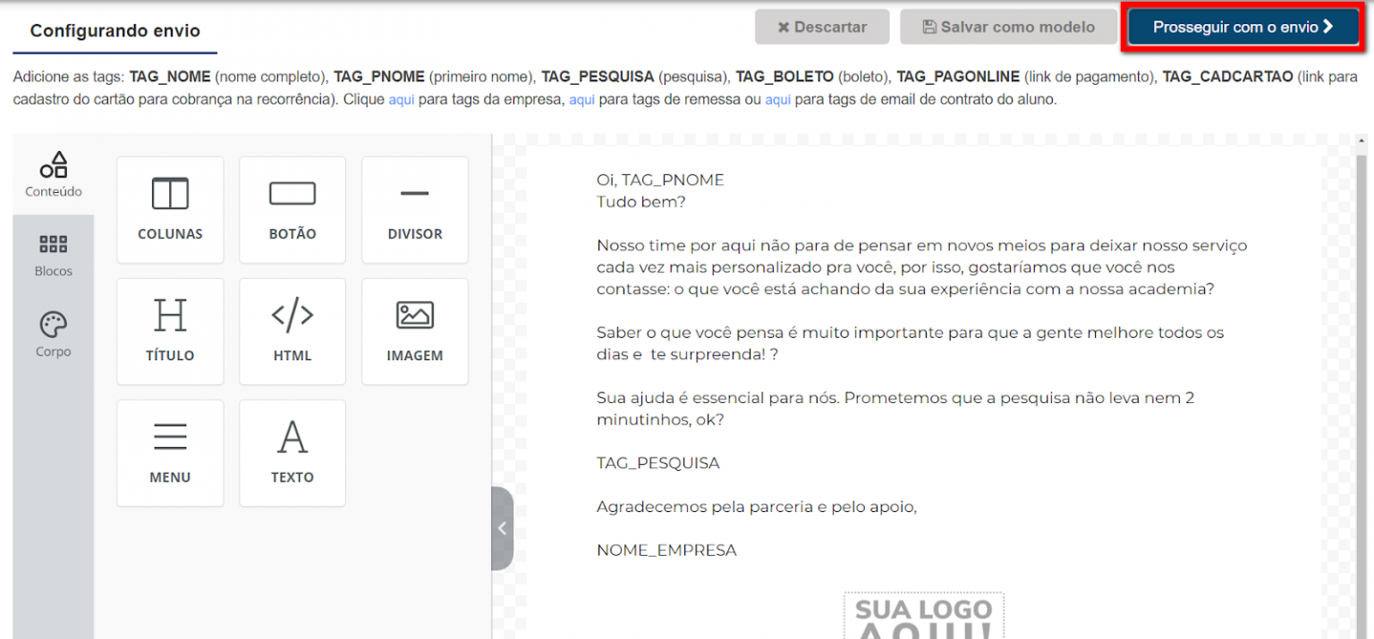 3. Será exibido o modelo de mensagem com base no template selecionado, faça as alterações desejadas e clique em "Prosseguir com o envio";