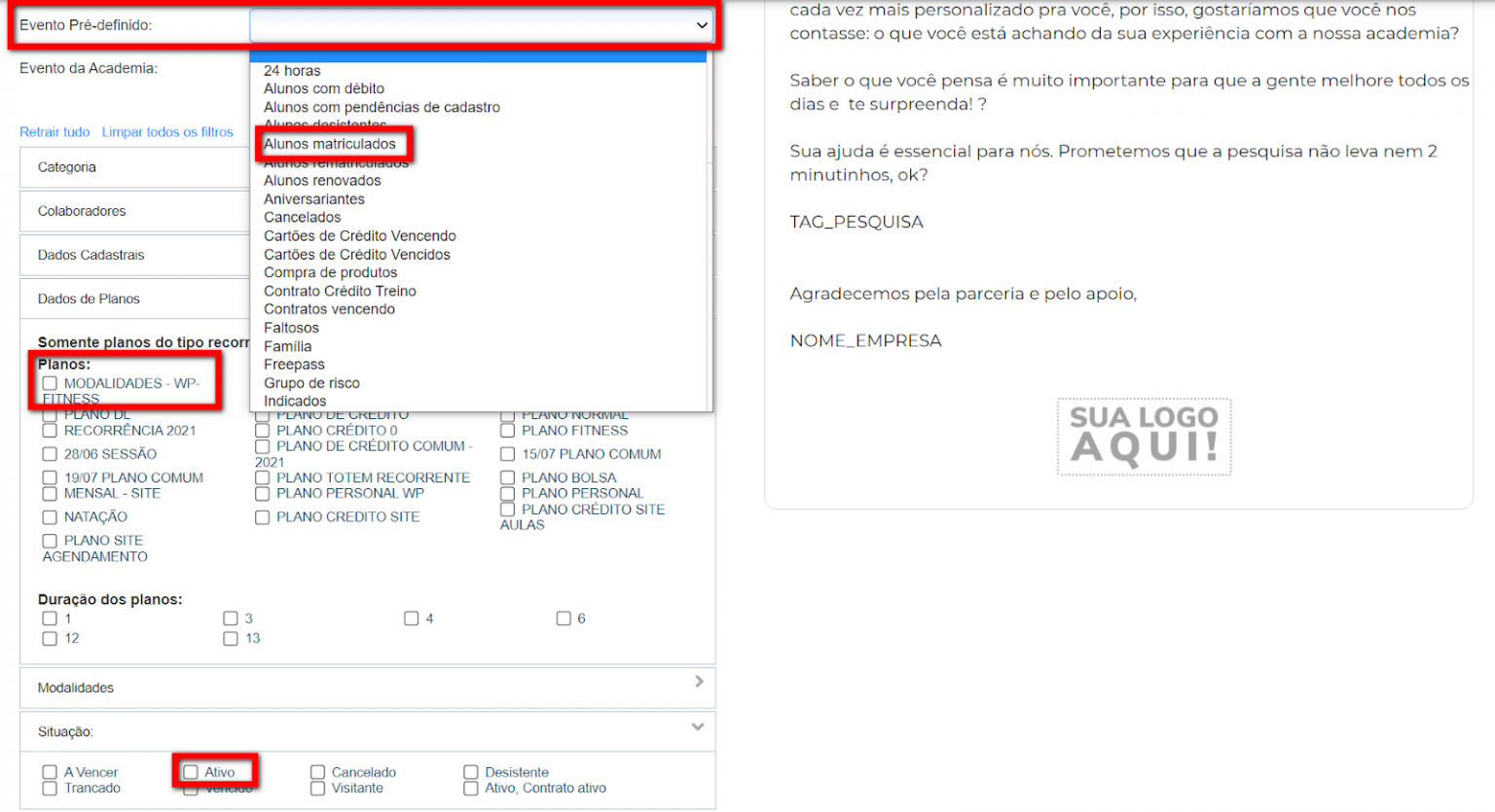 5. Chegou a hora de você definir para quem você deseja enviar essa pesquisa e para determinar esse grupo de pessoas, dentro do Sistema Pacto, você conta com uma gama de filtros distintos para conseguir identificar esse grupo em específico. Veja no exemplo abaixo que foi selecionado apenas pessoas que se matricularam na empresa nos últimos x dias, e contrataram um plano em específico e o status do seu cadastro é de Ativo. Além dessa definição você pode criar uma série de outras amostras a partir da mesclagem dos filtros do Sistema Pacto;