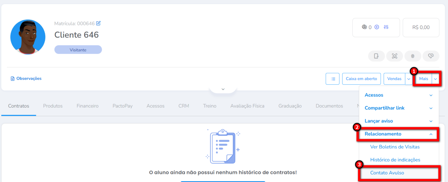 1. Na tela do cliente clique em "Mais". Em seguida clique em "Relacionamento" e em "Contato Avulso";