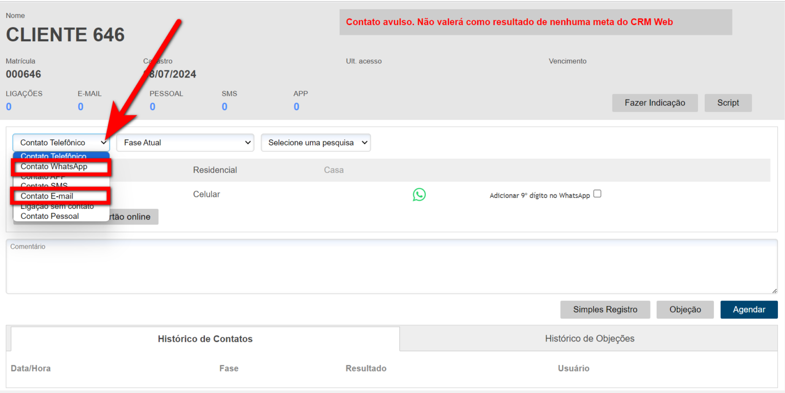 1. A partir de uma meta escolha uma forma de contato, sendo as disponíveis para essa situação: "Contato Whatsapp" ou "Contato E-mail";