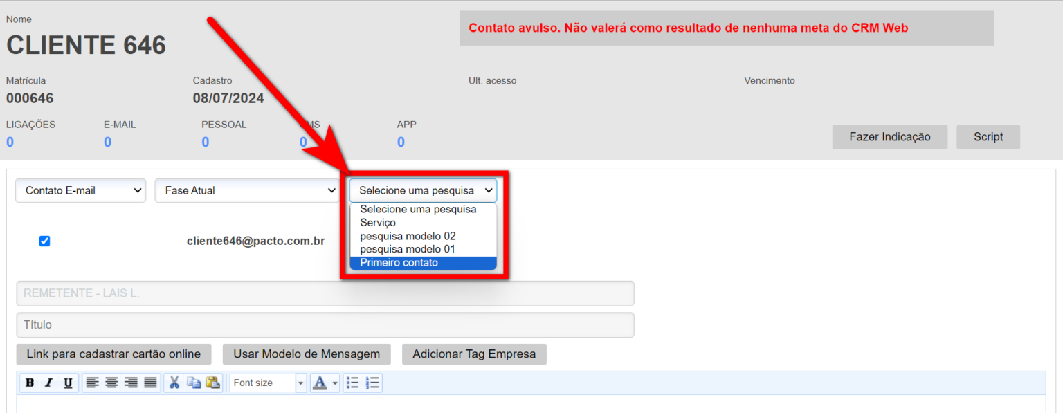 3. Após definido a forma de contato, defina o texto a ser enviado e clique em "Simples registro".