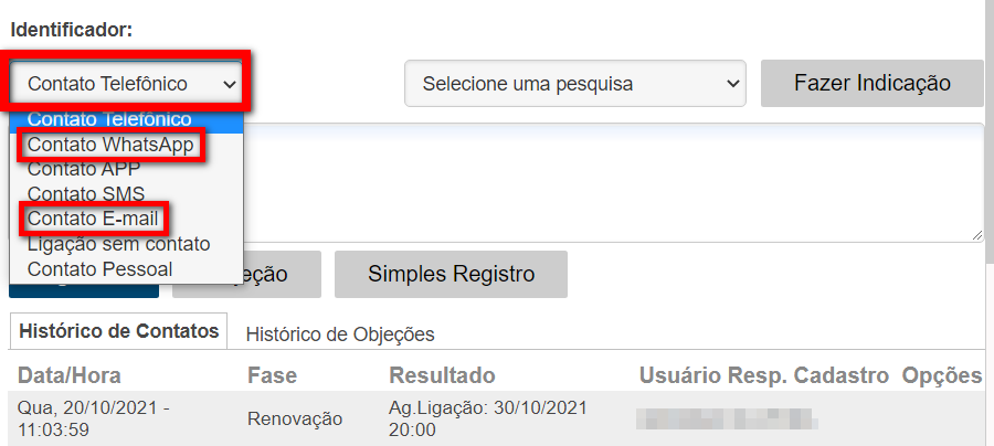 4. Depois de definido a forma de contato, defina o texto a ser enviado. Clique em "Simples registro" quando utilizado a opção "Contato WhatsApp", ou em "Enviar" caso marcado a opção "Contato E-mail";