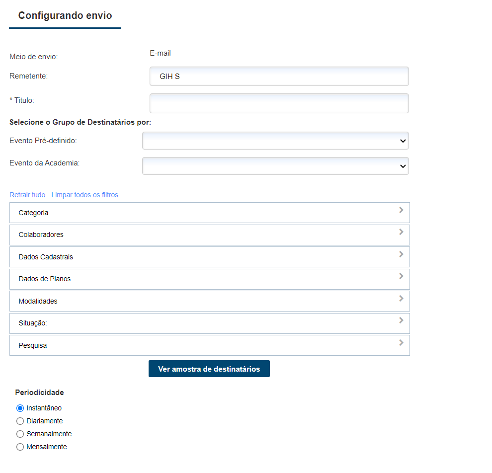 5.3. Em "Filtros", escolha os critérios que considerar relevantes para refinar a seleção dos destinatários;