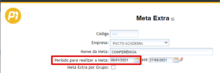- Meta Extra por Grupo: se deseja que esta meta seja executada por um determinado Grupo de Colaborador. Caso sim, basta marcar o checkbox a sua frente e selecionar o Grupo.
