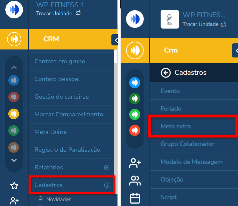 1. Acesse o Módulo CRM e clique na guia "Cadastros". Em seguida, clique em "Meta Extra";
