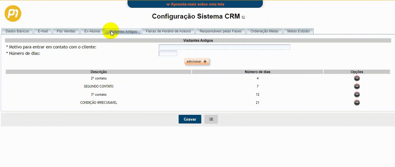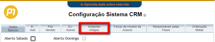 2. O sistema abrirá um pop-up com as configurações, clique na guia "Visitantes Antigos";