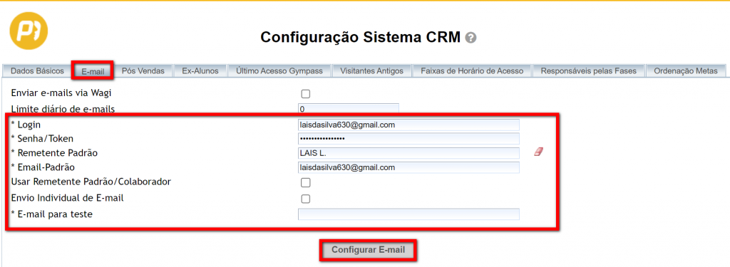 E-Mail Padrão: geralmente coloca-se o e-mail do gestor da academia usada para enviar os e-mails;