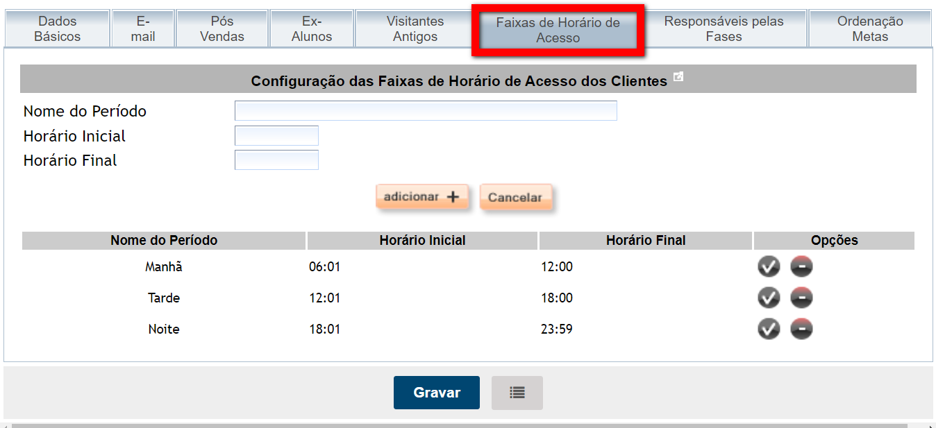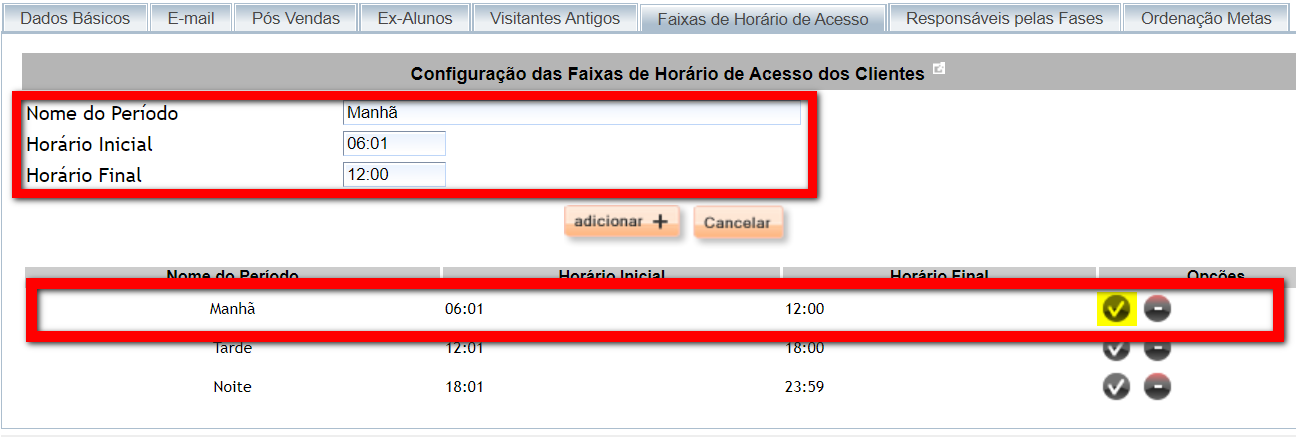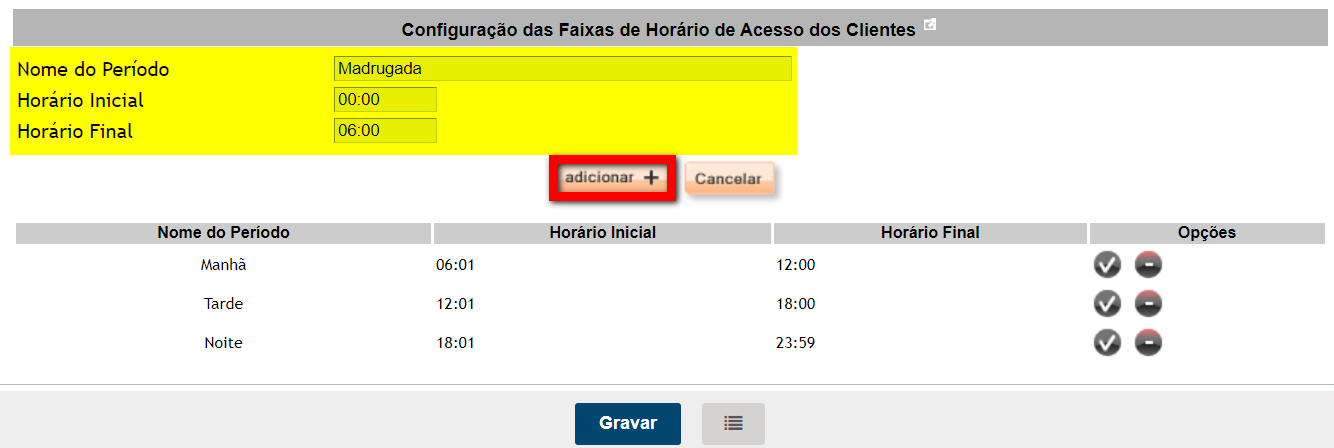 Observação: os horários inicial e final de todos os períodos não podem se chocar em nenhum minuto, pois caso ocorra, o sistema não permitirá adicionar este novo período.