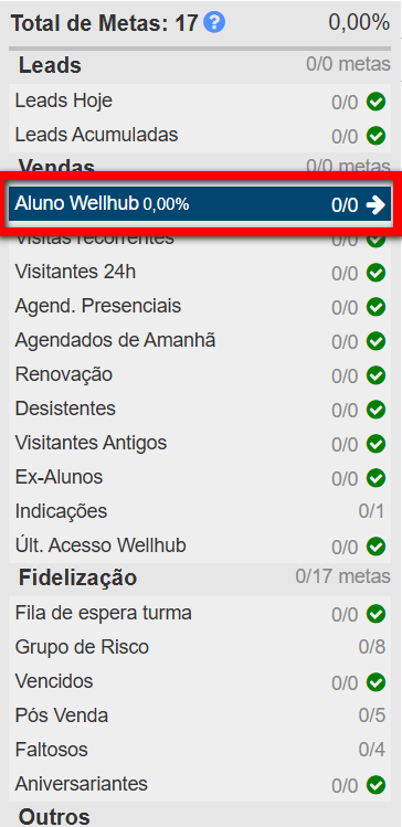 Na meta diária Aluno Wellhub serão apresentados todos cliente que possuem um token do Wellhub cadastrado.