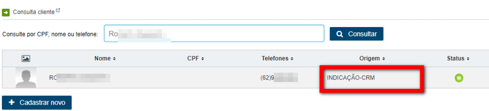 3. Ao digitar o nome, aparecerá um pré-cadastro já feito anteriormente com a origem “INDICAÇÃO-CRM“;