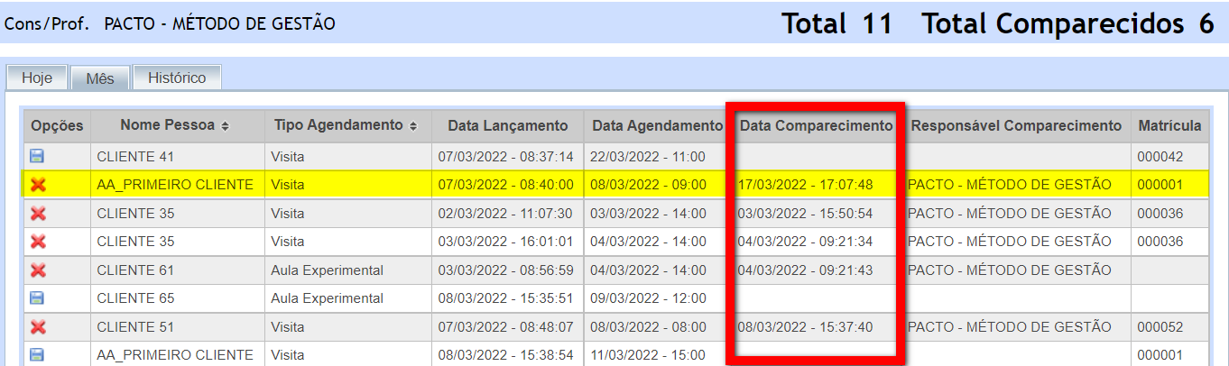 5. Para desmarcar um comparecimento, basta clicar no ícone a frente do nome do cliente.