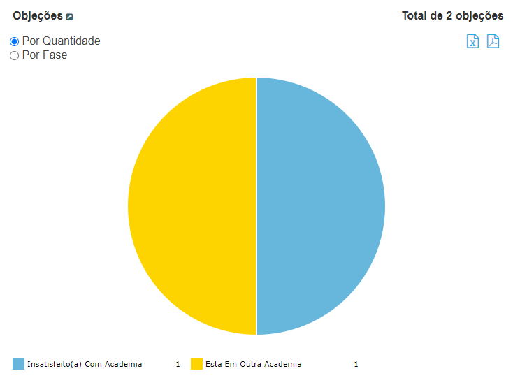 4. Você também consegue ver as objeções por quantidade ou por fase, e para isso use os filtros presentes no BI. Passando o mouse sobre o gráfico o sistema apresenta a quantidade e/fase.