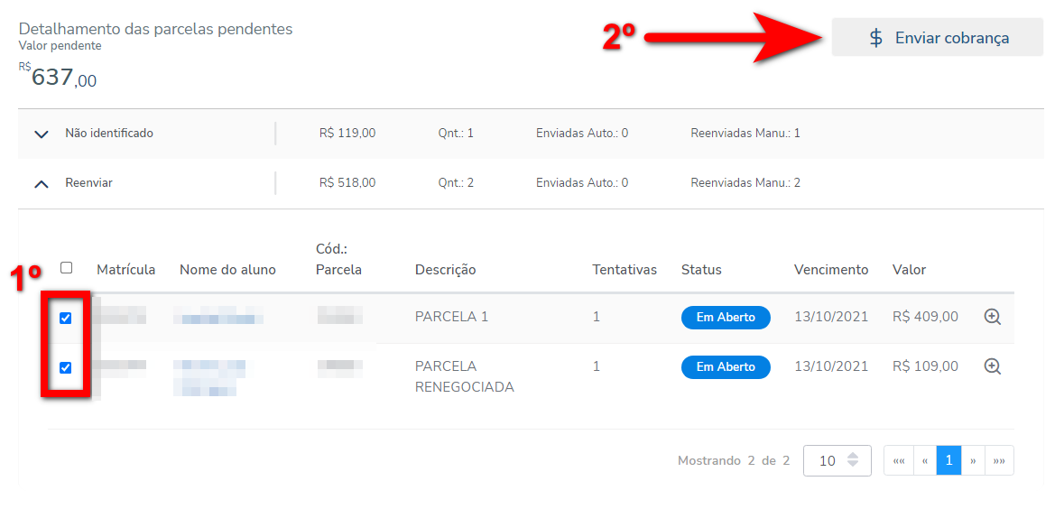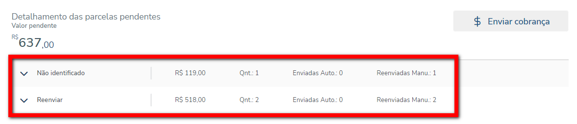 4. Será apresentado o detalhamento das parcelas pendentes, agrupadas em blocos. Cada bloco indica a ação sugerida, ou seja, se ainda é viável reenviar a cobrança ou se é necessário realizar outra operação, como atualizar ou trocar o cartão do aluno.