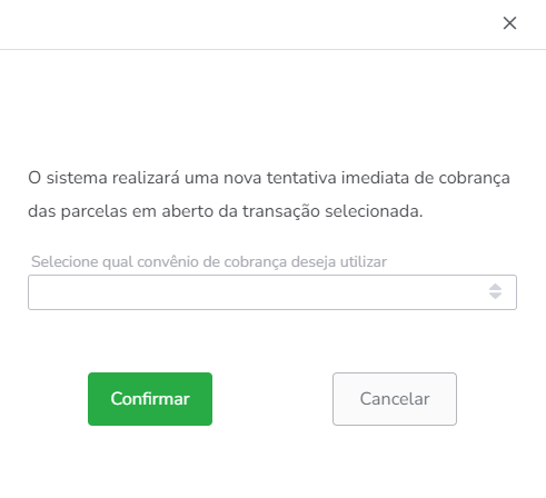 6. Será exibida uma nova tela para que você selecione o convênio de cobrança pelo qual a tentativa será realizada. Após selecionar, clique em "Confirmar".