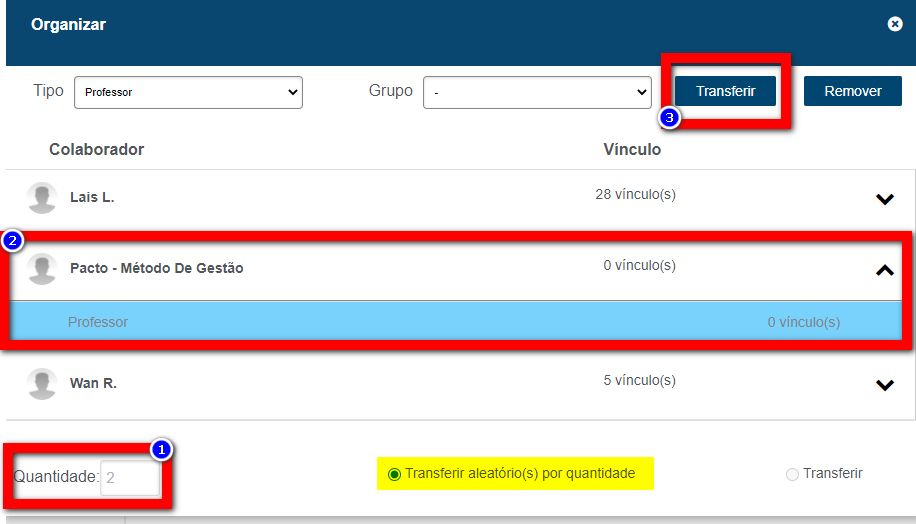 4. Com a opção marcada automaticamente pelo sistema, coloque a quantidade de alunos, selecione para qual colaborador e clique em "Transferir";