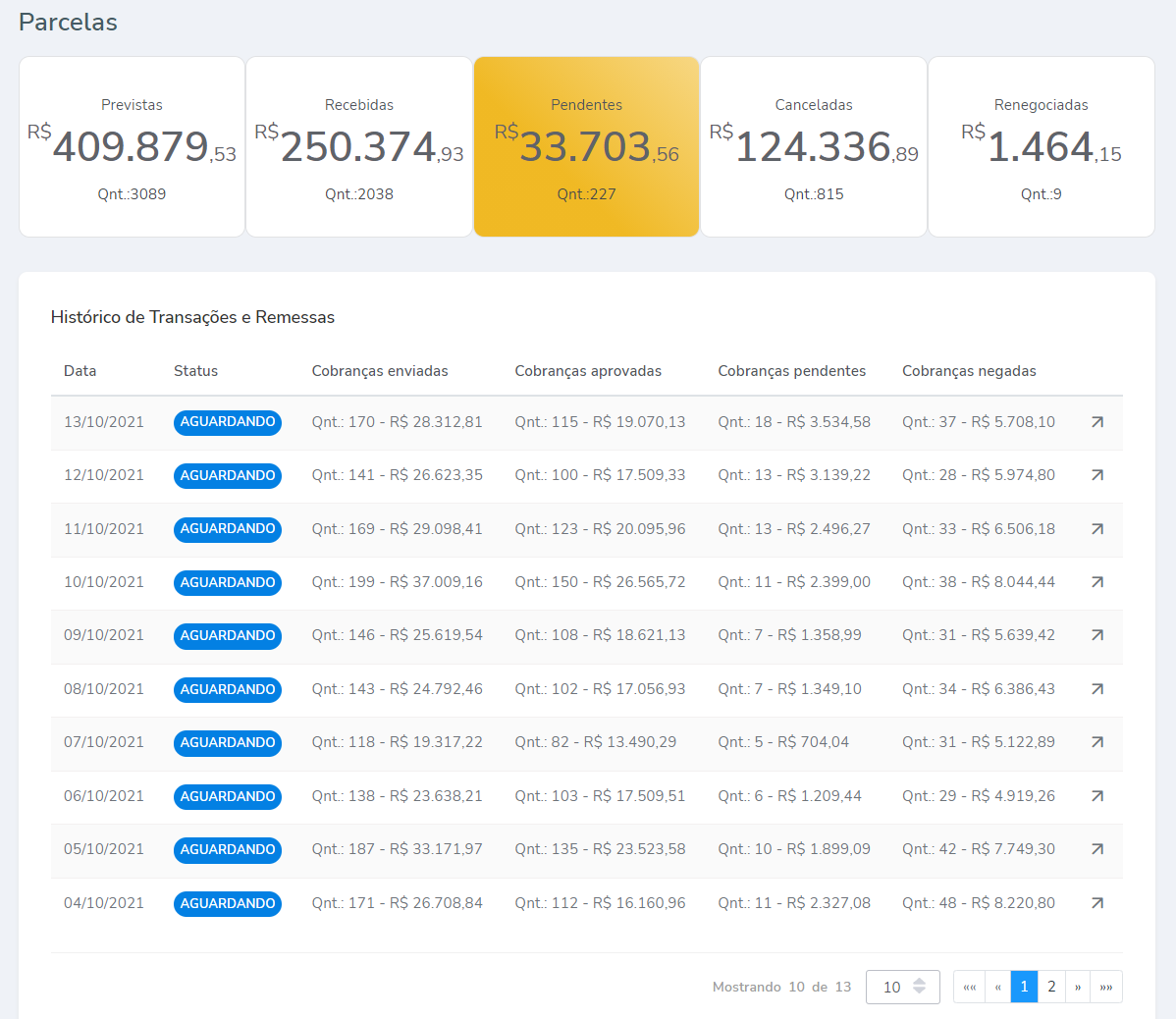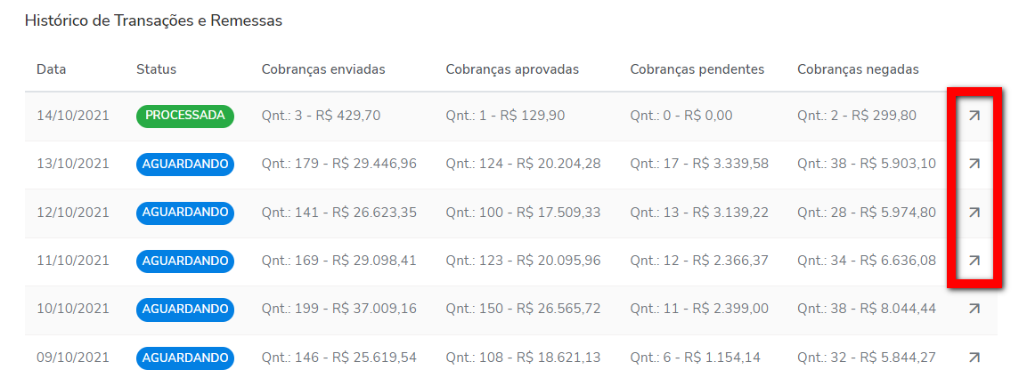 4.2. Campo "Histórico de Transações e Remessas". Neste campo, são apresentadas todas as cobranças realizadas, separadas por datas. Para uma análise mais detalhada, as cobranças são agrupadas por dia, indicando a quantidade de enviadas, aprovadas, pendentes e negadas.