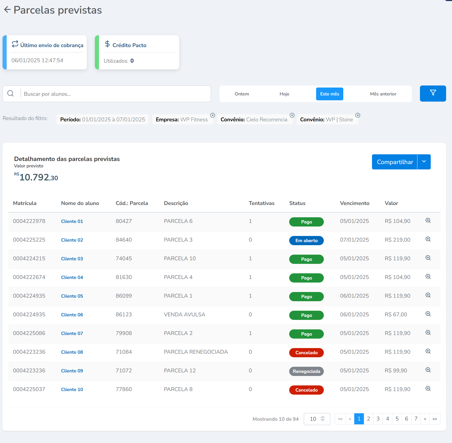 Além disso, exibe de forma detalhada os valores totais de cobranças previstas, recebidas, pendentes, canceladas e renegociadas no período consultado.