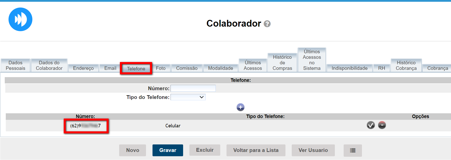 3. Localize e clique na guia “Telefone” para confirmar ou incluir o telefone celular do colaborador;