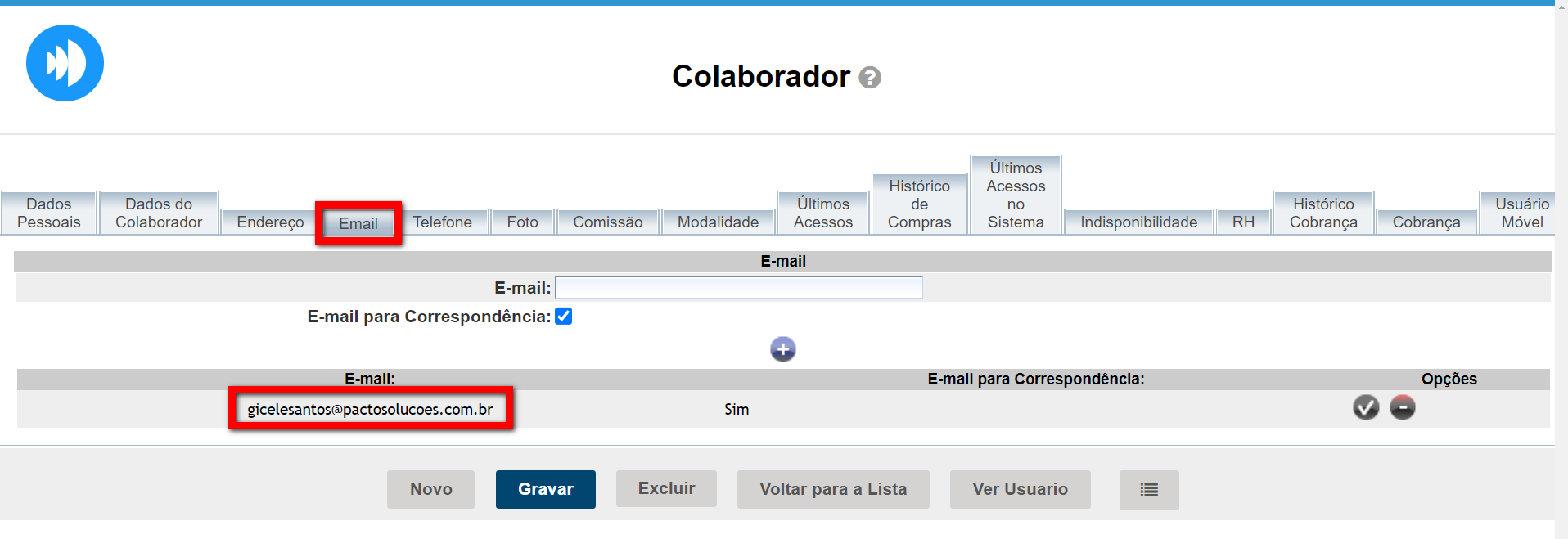 3. Em seguida, clique na guia “E-mail” para confirmar ou incluir o e-mail do colaborador;