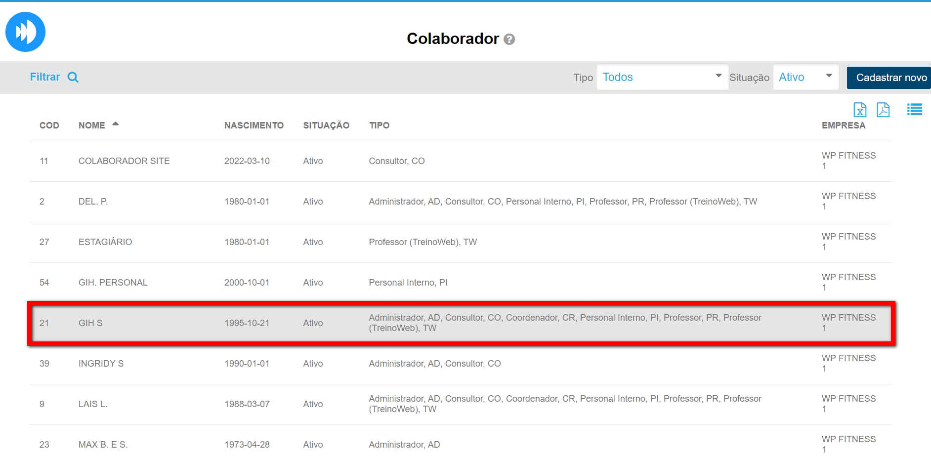 2. Será apresentada a tela onde consegue visualizar todos os colaboradores cadastrados. Identifique o cadastro do colaborador desejado e clique nele;