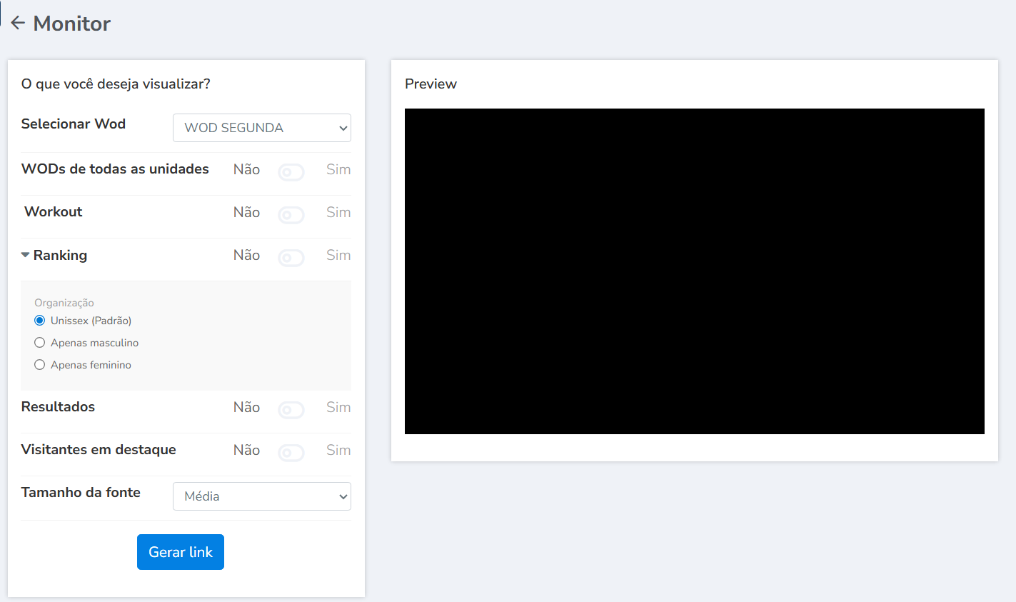 3. Marque as opções que desejar, sendo obrigatório selecionar um Wod, e pelo menos 1 das opções de exibição, depois clique em "Gerar link";
