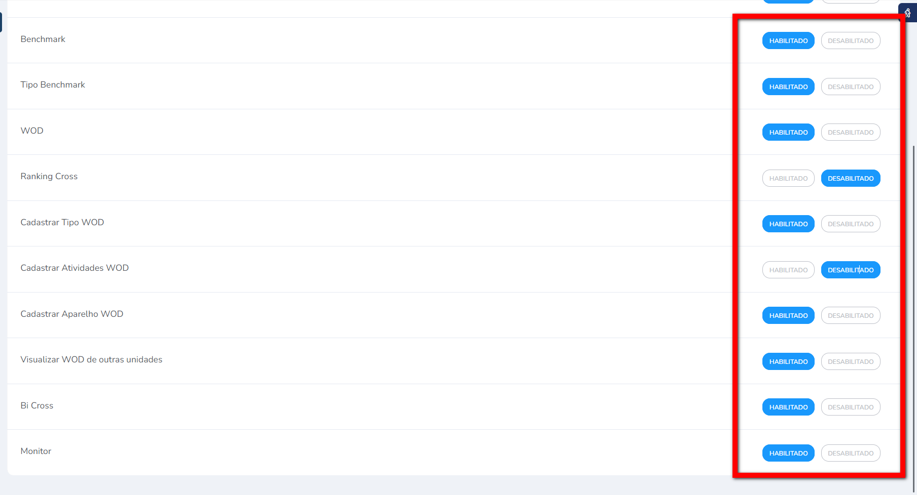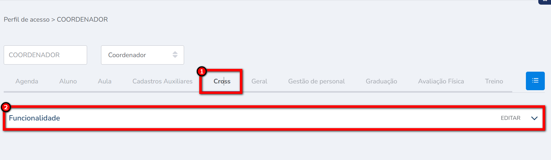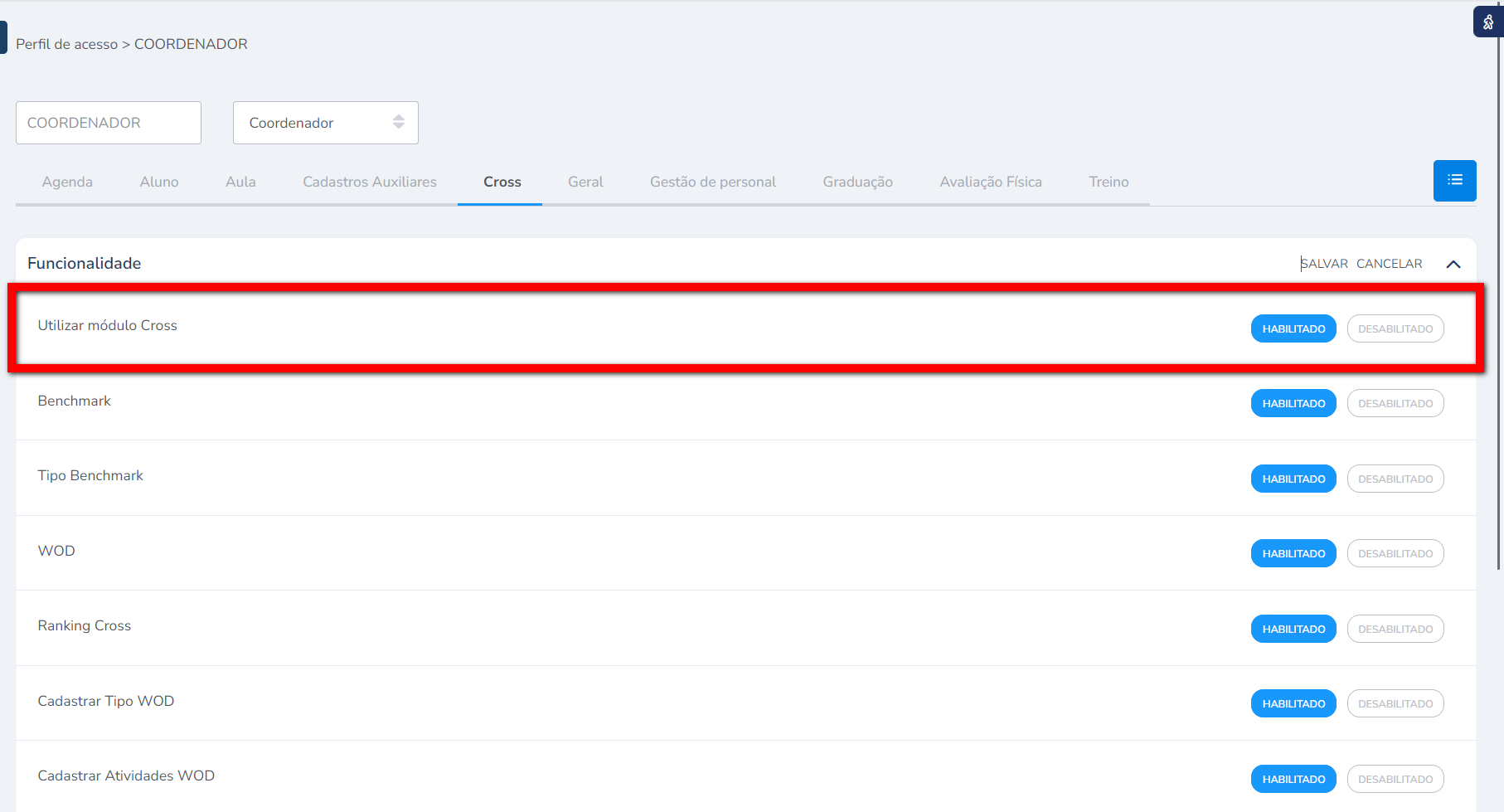 Para utilizar o módulo Cross, é necessário que os usuários tenham as permissões para realizar as operações no módulo, tais como cadastrar WOD, Benchmarks dentre outros.