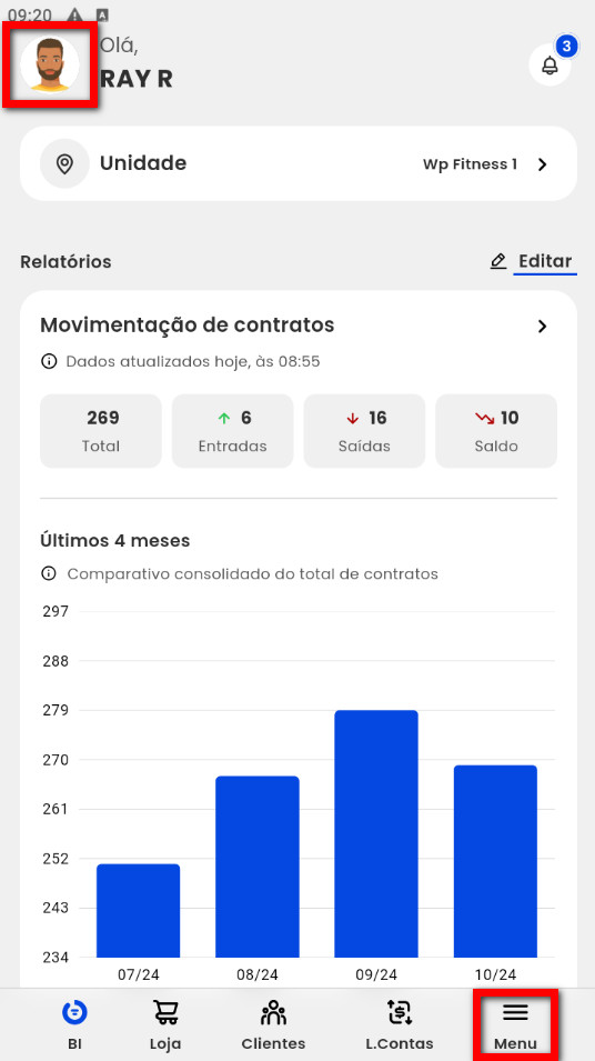 2. No aplicativo Pacto App, clique sobre a foto de perfil ou em "Menu";