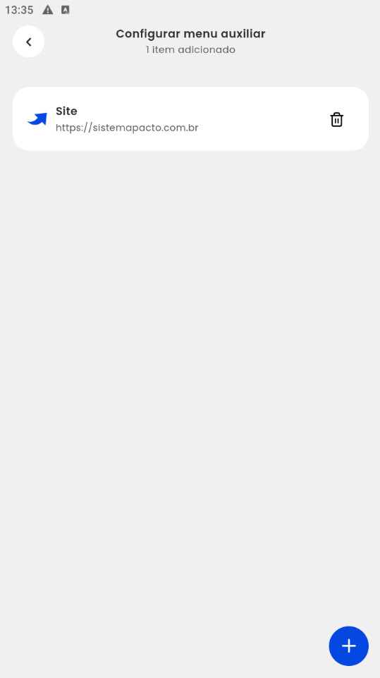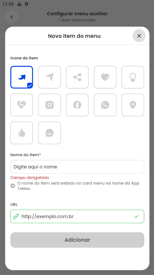 - Configurar menu auxiliar: nesta opção, consegue realizar a configuração do link que será apresentado no App Treino;