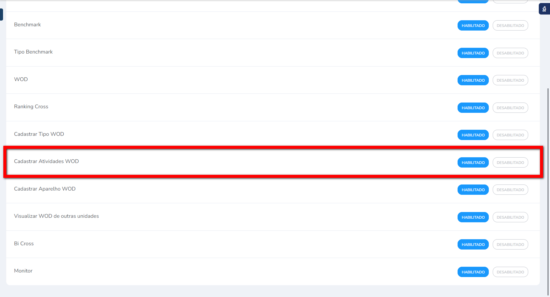 4. Localize a permissão "Cadastrar Atividades Wod" e clique em um dos botões apresentados à sua frente (habilitar ou desabilitar);