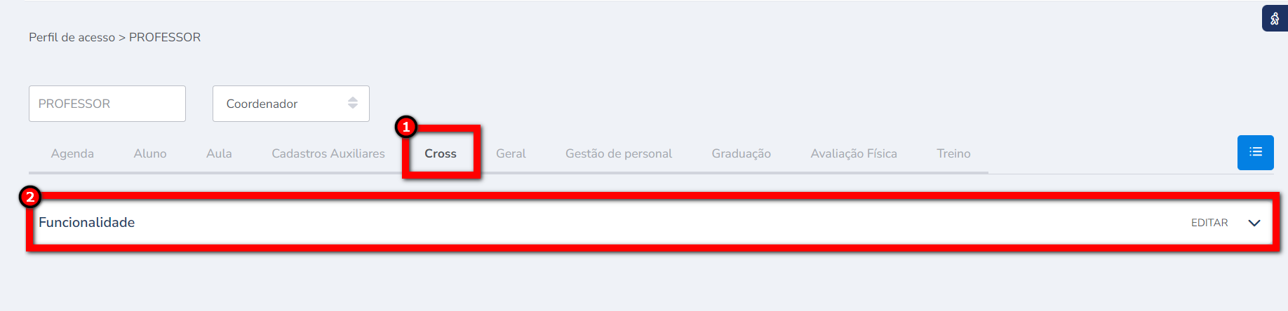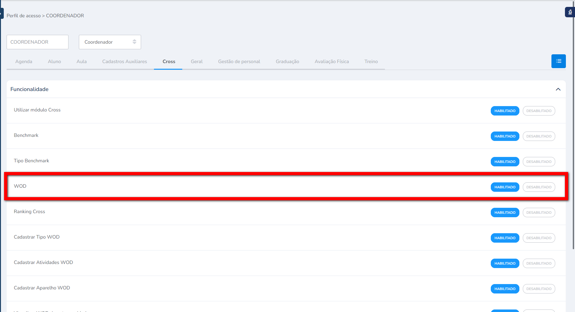 Para realizar o cadastro do WOD para ser utilizado no módulo Cross, é necessário que o usuário tenha a permissão habilitada, e assim pode realizar os cadastros do WOD do dia, da semana ou até mesmo do mês.