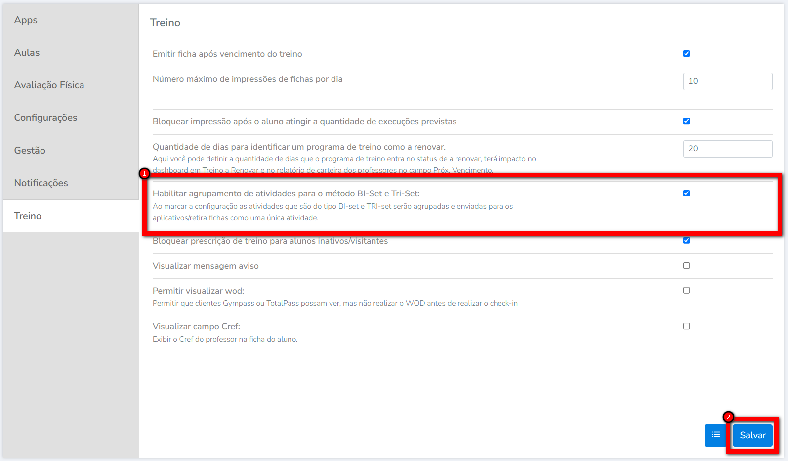 4. Localize e marque a opção "Habilitar agrupamento de atividades para o método BI-Set e Tri-Set". Após clique em "Salvar".