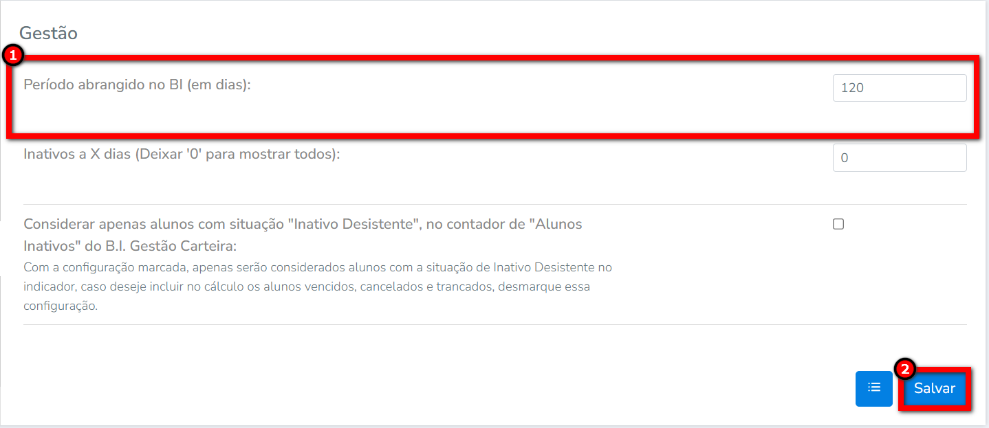 5. No campo "Período abrangido no BI (em dias)" configure a quantidade de dias desejados para que sejam apresentados os dados no BI Treino;