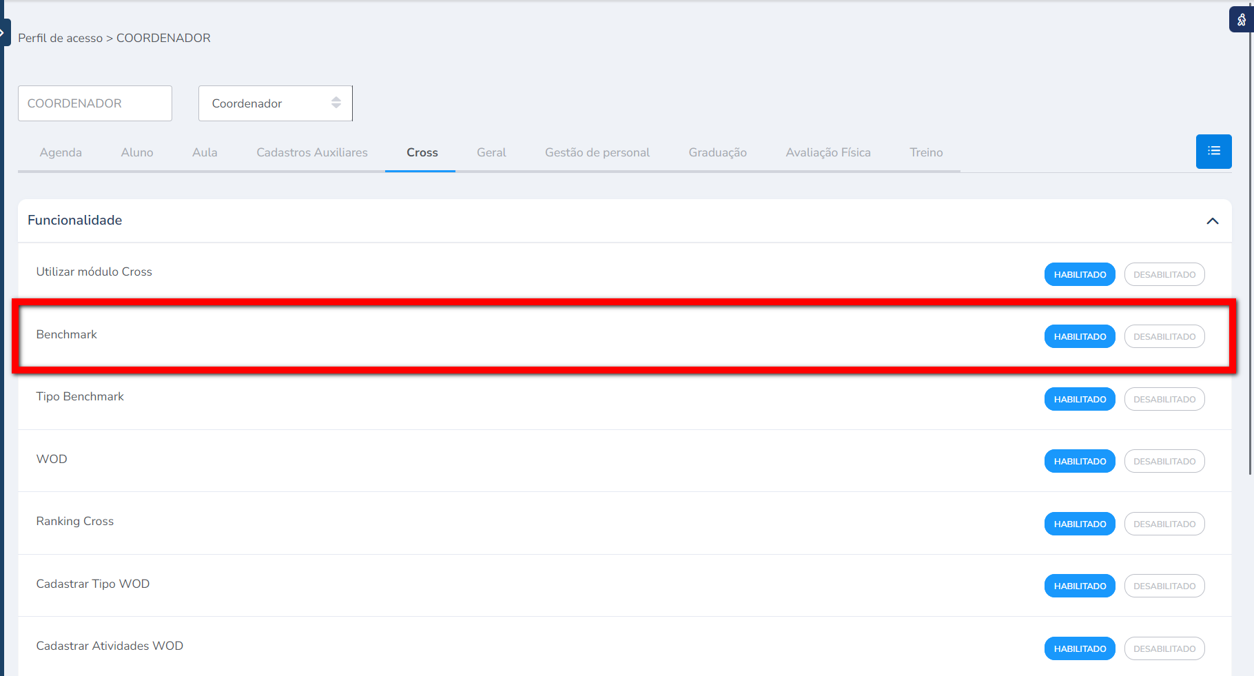 Para que o usuário possa realizar o cadastro do Benchmark a ser utilizado no WOD é necessário ter a permissão habilitada.