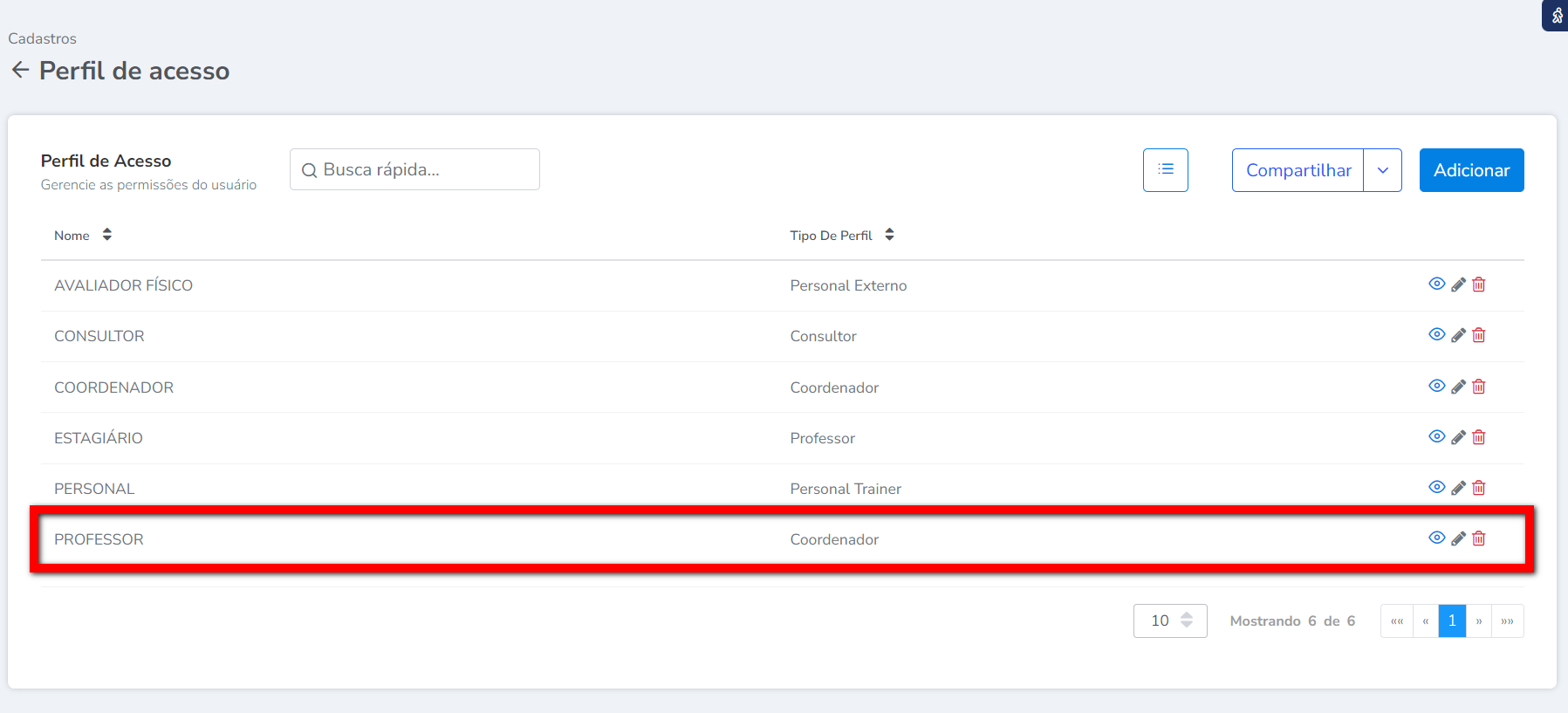 2. Ao apresentar os tipos de perfis, clique no perfil referente ao colaborador que deseja habilitar/desabilitar a permissão;