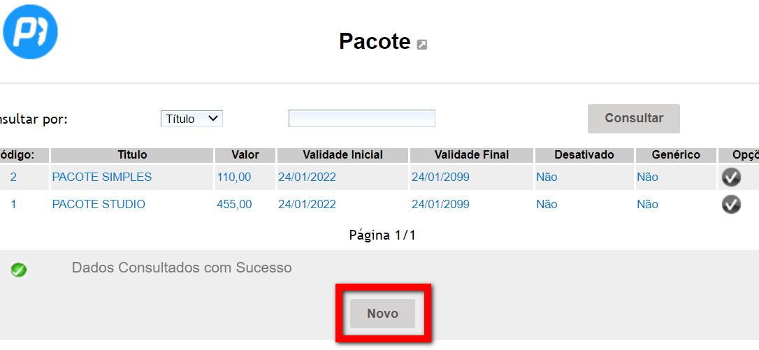 4. Será apresentada uma nova tela, indicando todos os pacotes cadastrados, clique em “Novo”;