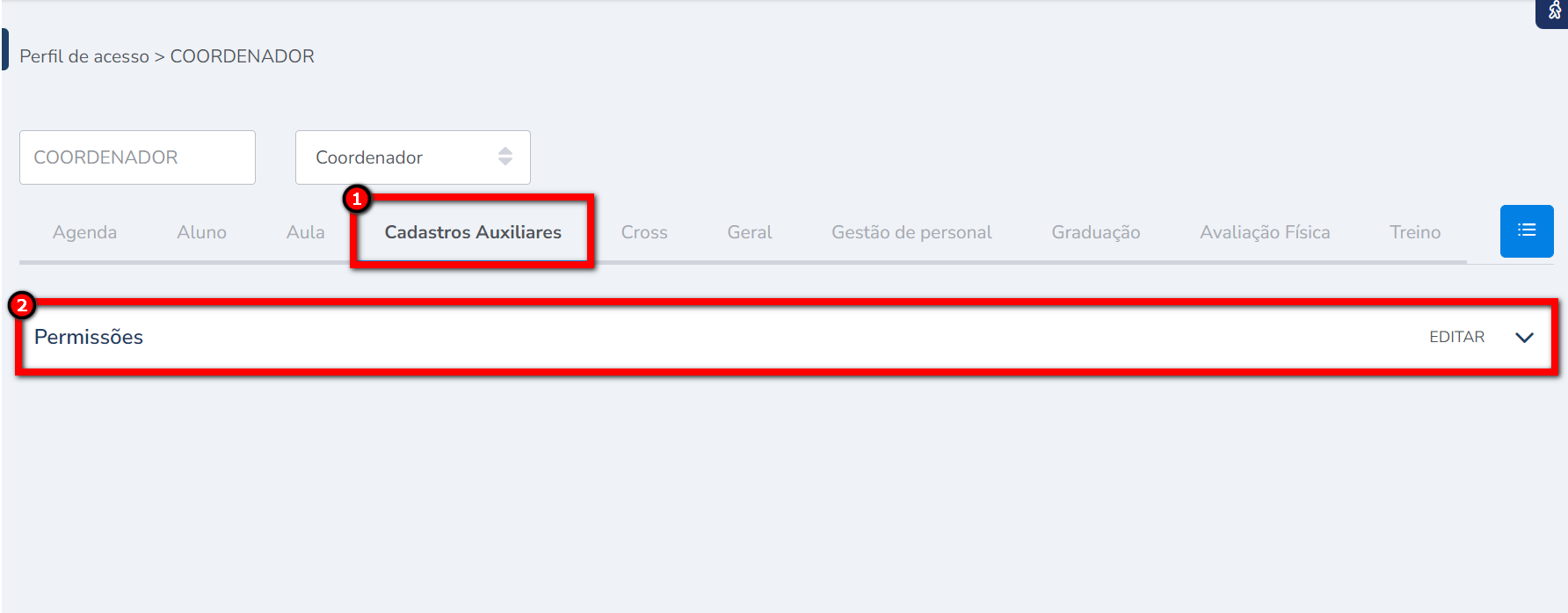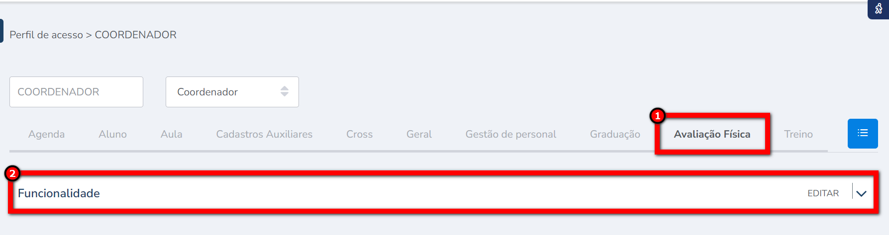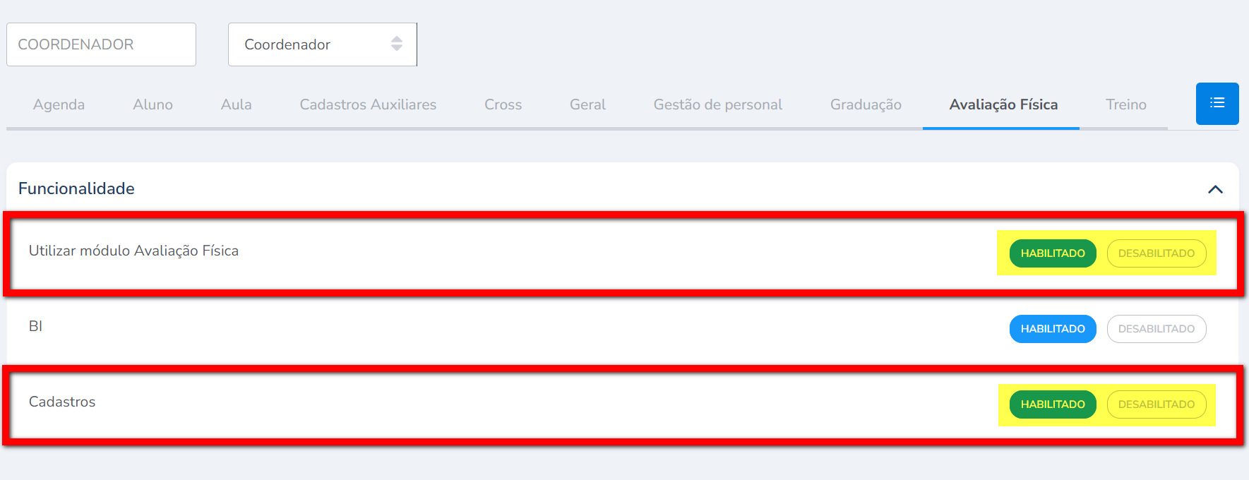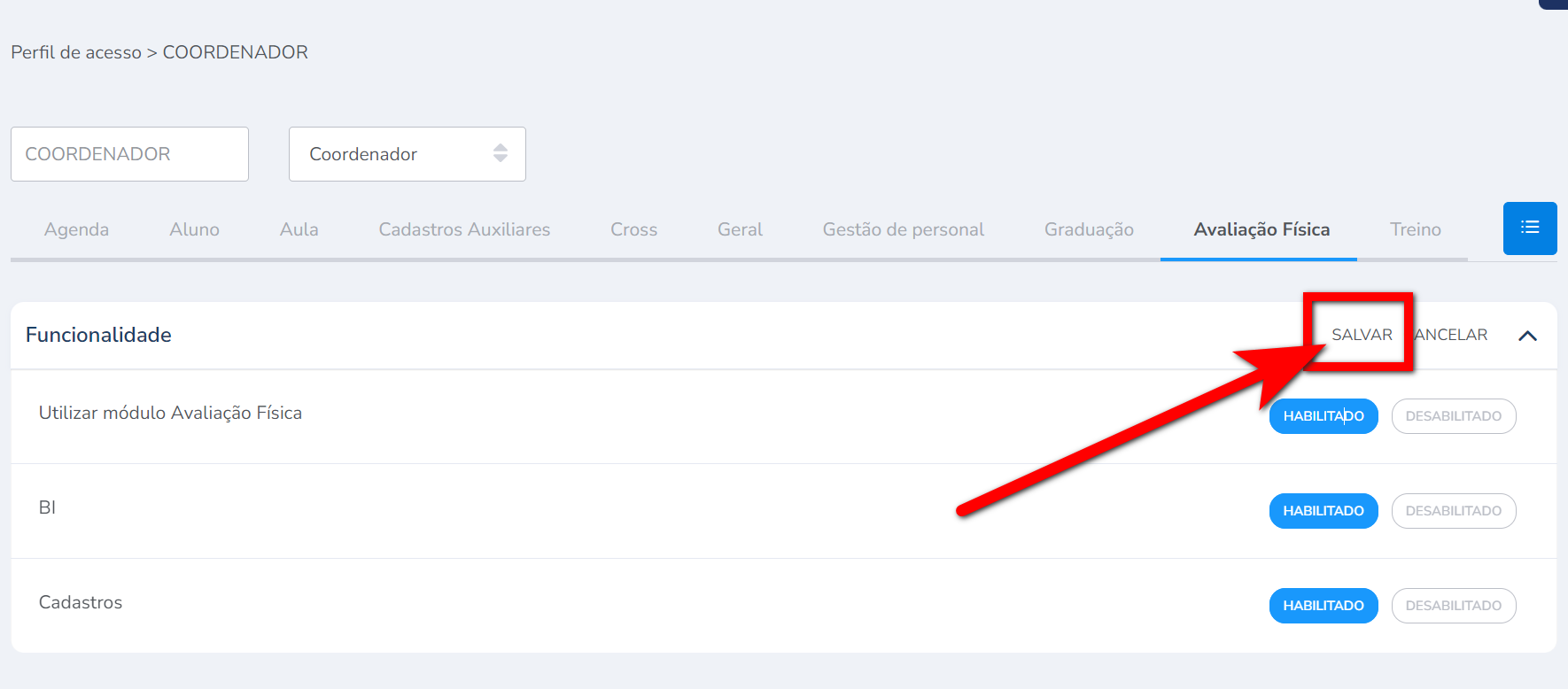 3.1. Localize as permissões "Utilizar módulo Avaliação Física" e "Cadastros" e clique em habilitar/desabilitar a permissão;