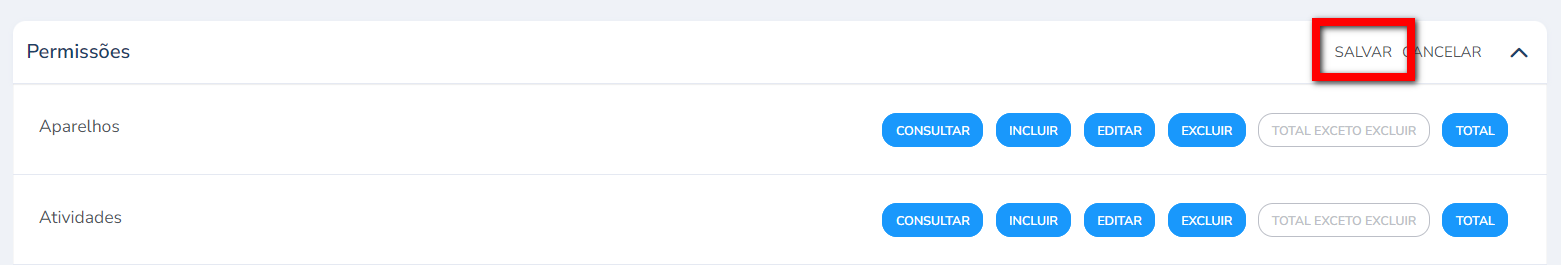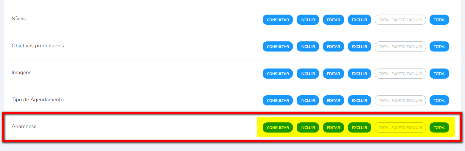 - Total sem excluir: poderá realizar as ações de consultar, incluir e editar;