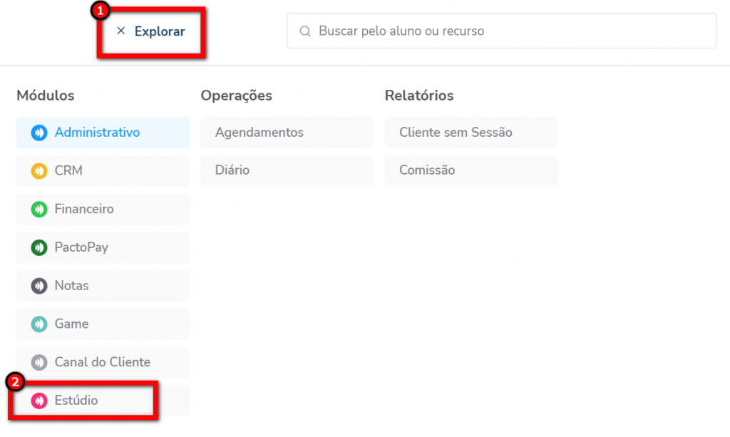 1. Acesse o sistema e clique em "Explorar". Após clique no módulo "Estúdio";