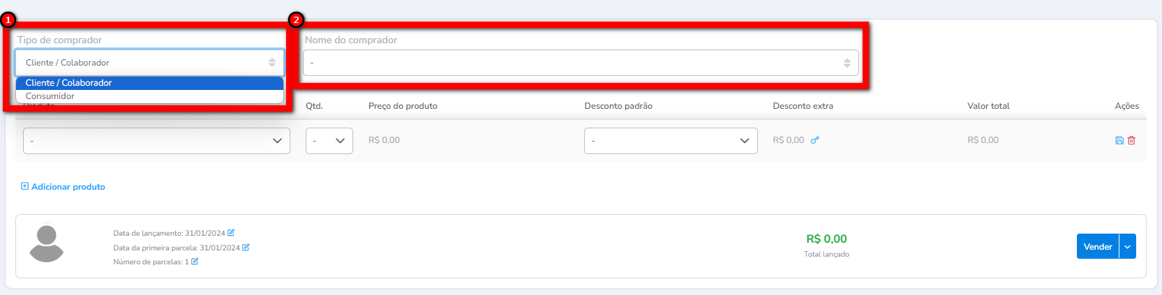 4. Na tela de venda, selecione o Tipo de comprador “Cliente / Colaborador”, depois, no campo “Nome Comprador” pesquise pelo nome do cliente que deseja adquirir o serviço;