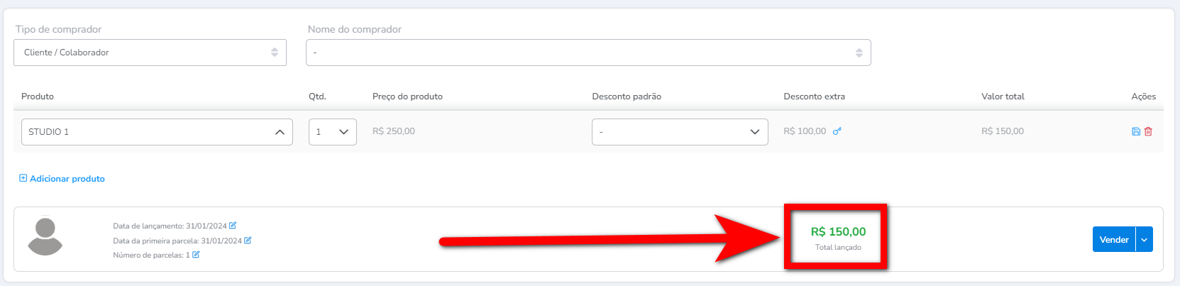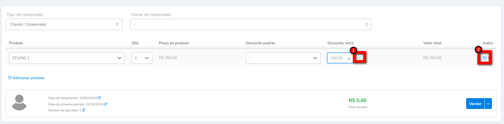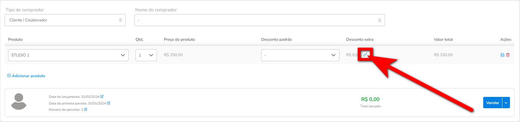 5.1. Será exibido o valor da compra. Caso deseje adicionar desconto a este produto, basta clicar neste ícone e definir no campo “Desconto” o valor desejado.