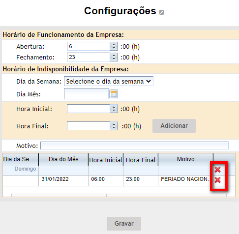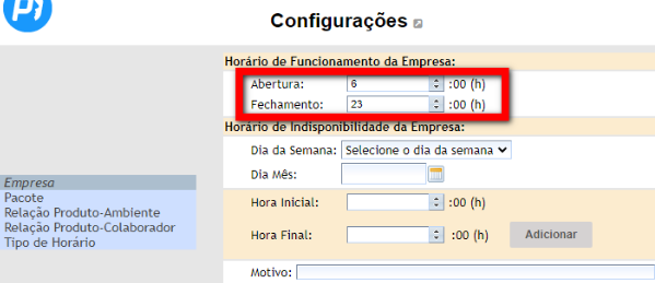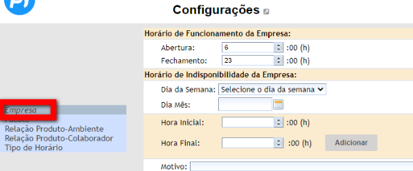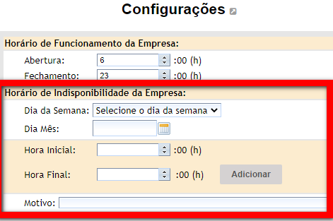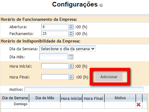 5. Para cadastrar o horário de indisponibilidade da empresa, preencha os campos;