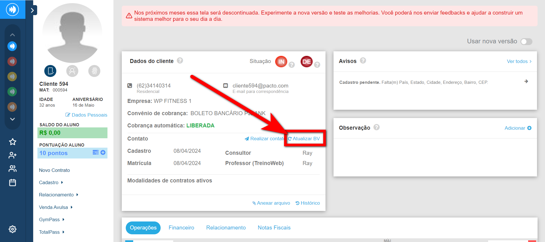1. Acesse o perfil do cliente e na tela inicial, localize clique em “Atualizar BV”;