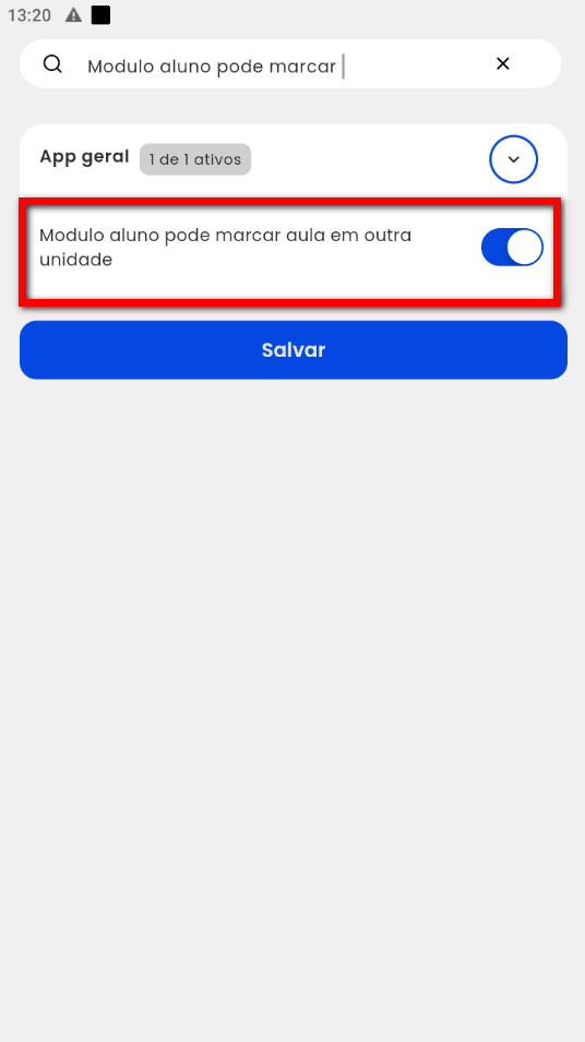 4. Localize e habilite a permissão “Modulo aluno pode marcar aula em outra unidade“;