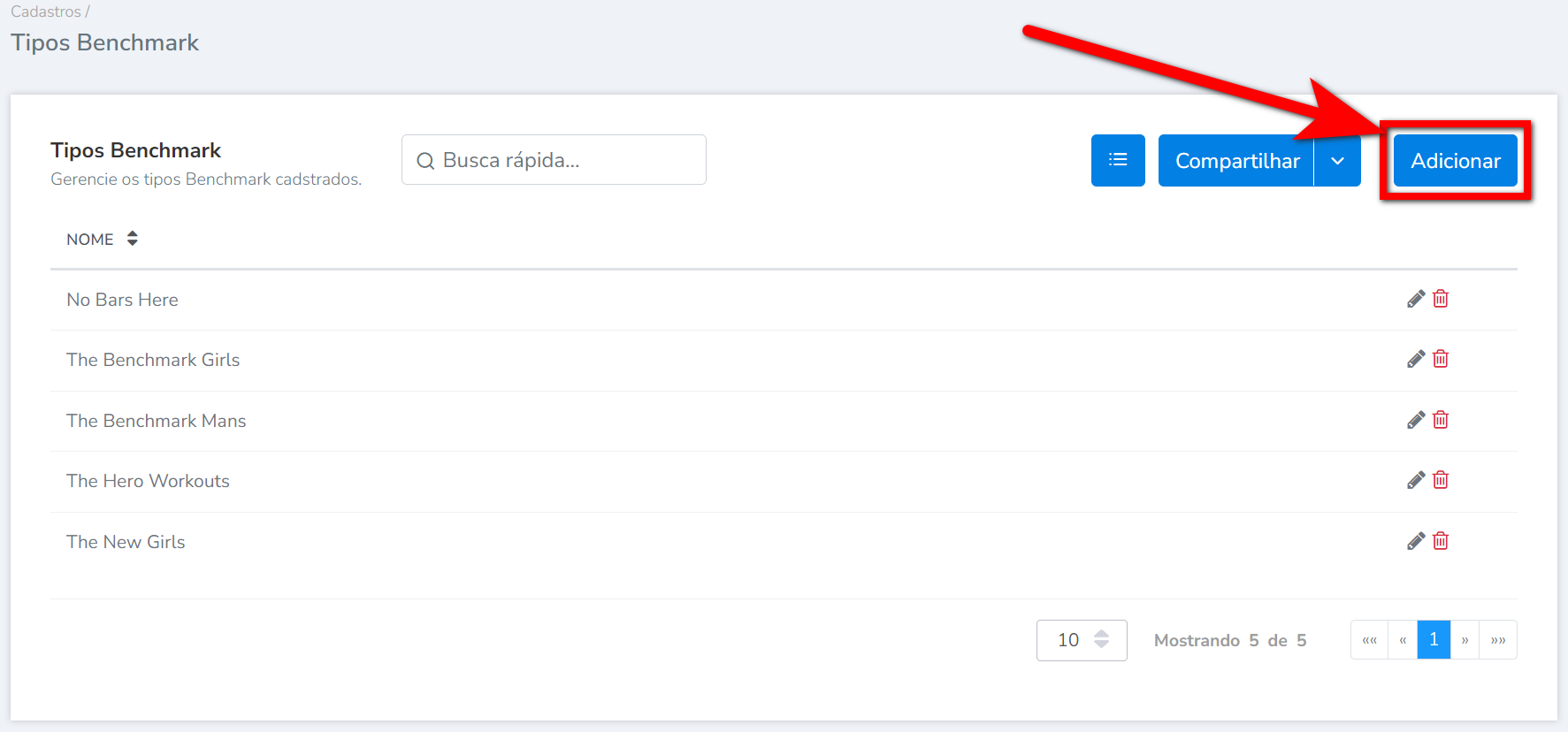 3. Será apresentado uma nova tela exibindo todos os cadastros de tipo benchmark. Para cadastrar um novo, clique em "Adicionar";