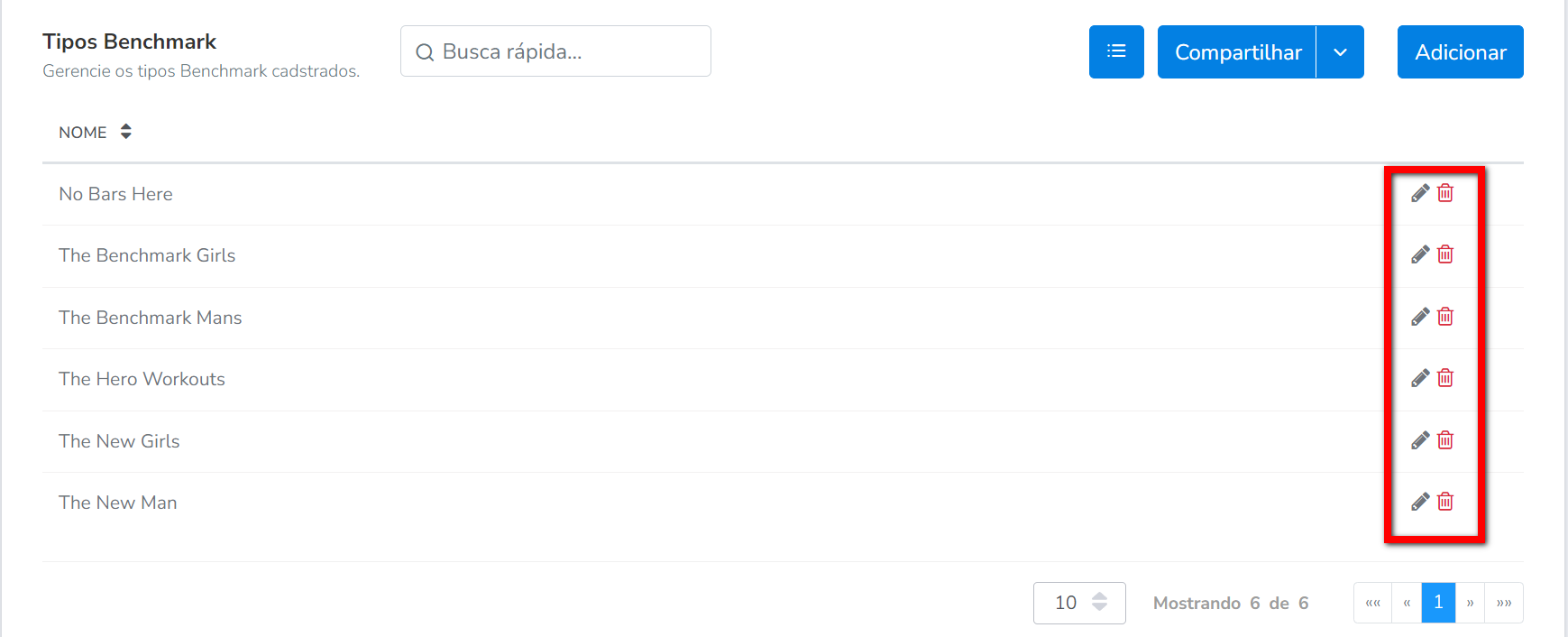 5. Caso deseje realizar edições em algum cadastro, clique no ícone à frente do nome do tipo de benchmark. E caso deseje excluir algum cadastro, clique no ícone